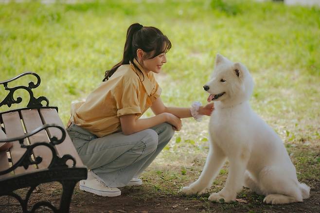 권나라가 편안하면서도 세련된 산책룩을 연출했다. 옅은 노란색 셔츠와 연청 데님 팬츠의 조합은 자연스러운 분위기를 자아내며, 흰 스니커즈로 캐주얼함을 더했다. 여기에 흰색 곱창밴드로 묶은 헤어스타일은 사랑스러운 이미지를 강조한다. 옆에 앉아 있는 하얀 강아지와 어우러진 모습이 따뜻하고 친근한 느낌을 준다.