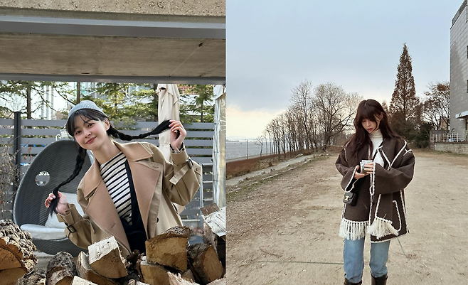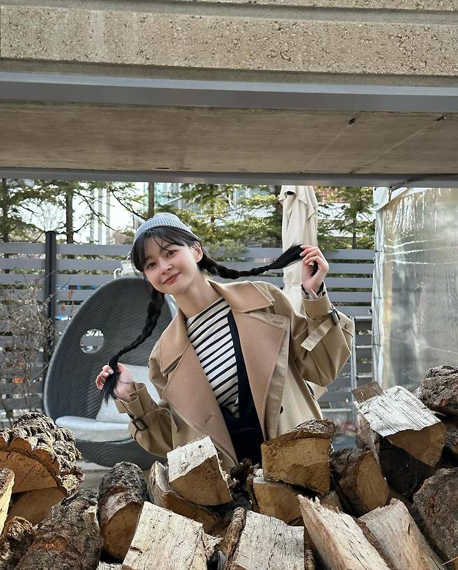 스트라이프 티셔츠와 트렌치코트를 활용해 모던하면서도 캐주얼한 스타일을 보여줬다. 트렌치코트는 클래식한 아이템이지만, 안에 입은 스트라이프 티셔츠와 함께 경쾌한 느낌을 준다. 여기에 양갈래로 땋은 머리 스타일은 발랄함을 더하며, 전체적으로 자유롭고 개성 있는 분위기를 완성했다.