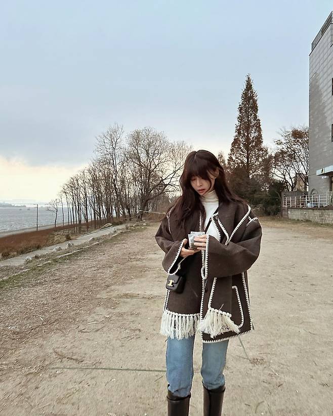브라운 색상의 프린지 디테일 코트를 활용해 겨울철 세련된 룩을 선보였다. 코트의 화이트 트리밍과 프린지가 포인트가 되어 클래식하면서도 독특한 매력을 더한다. 이너로 화이트 터틀넥을 매치하고, 청바지와 블랙 롱부츠를 착용해 깔끔하면서도 실용적인 겨울 스타일을 완성했다.