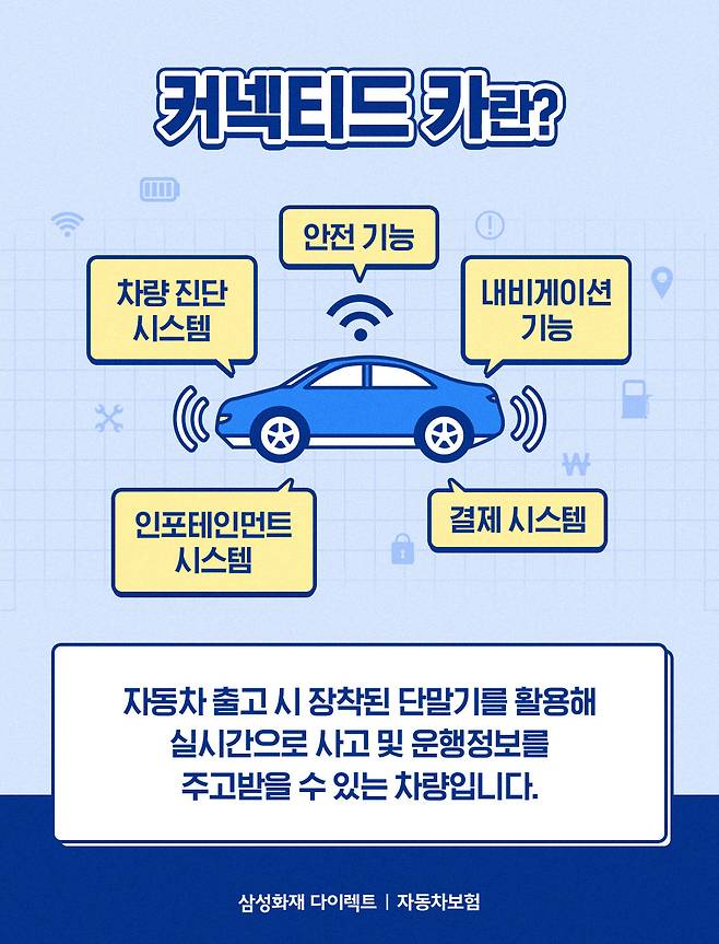기술과 함께 편리해진 운전 생활! 이제 삼성화재 다이렉트 자동차보험의 커넥티드카 할인 특약으로 편리함과 안전은 물론, 더욱 스마트한 운전 생활까지 누려보세요.