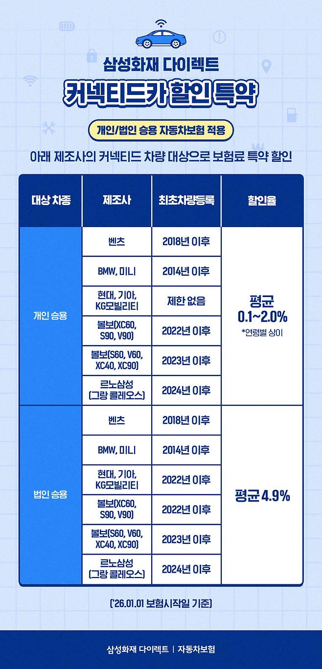 이러한 커넥티드 카 중 차량 제조사가 벤츠, BMW, 미니, 현대, 기아, KG모빌리티(구 쌍용), 볼보(XC60, S90, V90, S60, V60, XC40, XC90), 르노삼성(그랑 콜레오스)인 차량의 오너라면 삼성화재 다이렉트 자동차보험의 커넥티드카 할인 특약에 가입할 수 있는데요.