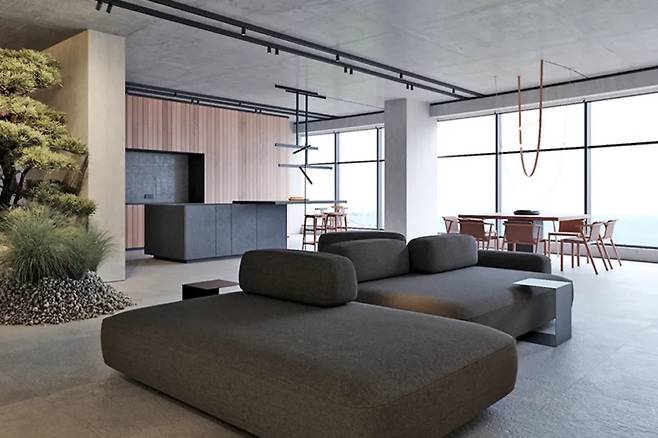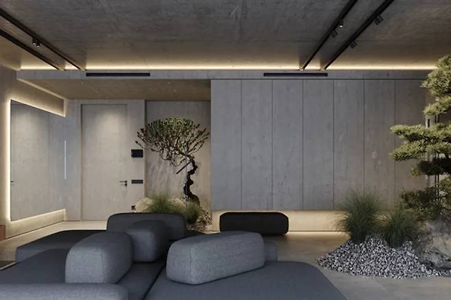 회색 계열로 꾸며진 거실은 사막의 한 장면을 연상시킨다. 물결처럼 부드럽게 마감된 시멘트 벽과 깔끔하게 정돈된 바닥과 천장은 주변 가구의 질감을 돋보이게 한다.