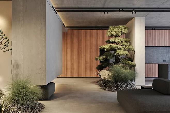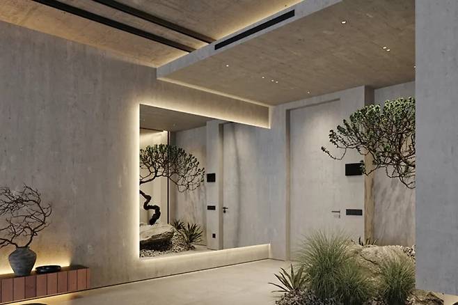 미니멀리즘과 대담함이 공존하는 입구는 마치 갤러리를 방불케 하며, 여백의 미와 긴장감이 조화롭게 어우러져 있다.