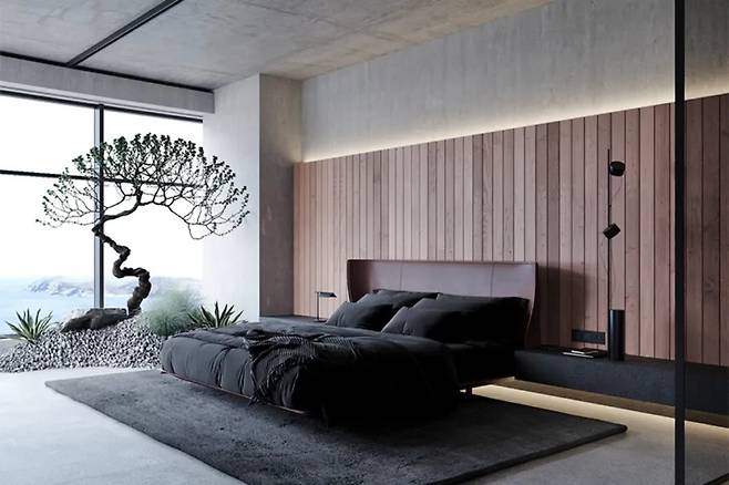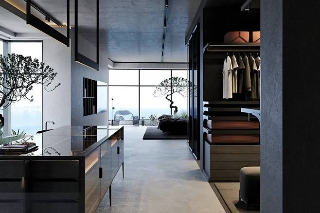 무채색 침구와 텍스처가 돋보이는 암석 조형물은 리조트처럼 세팅되어 있다. 철제 프레임의 조명이 천장에서 내려오고, 한쪽 구석에는 검은 강철 소재의 행잉 랙이 놓여 있다. 이러한 요소들은 과도한 장식 없이도 고급스러운 긴장감을 자아낸다.