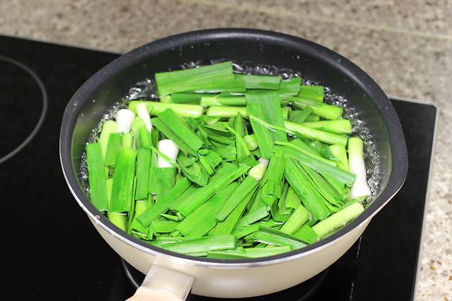 이제 나머지 초록 줄기부분도 넣고 20초 정도 더 데칩니다.