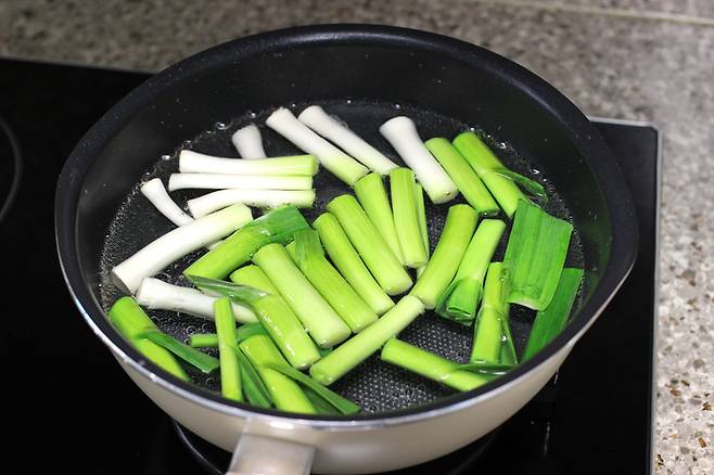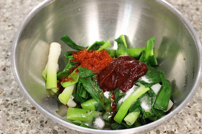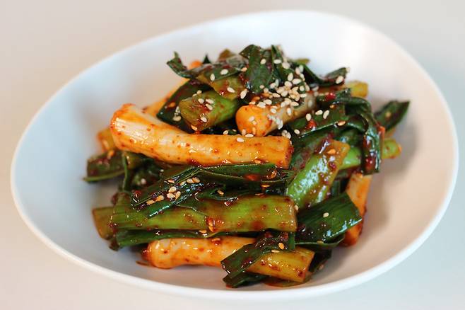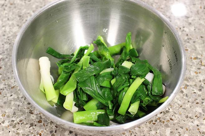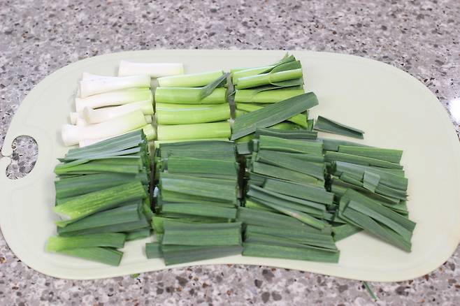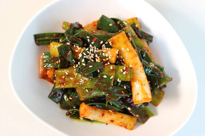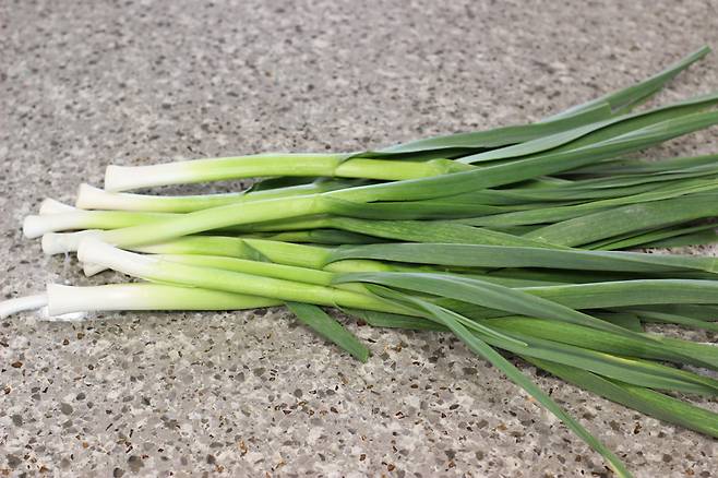 대파처럼 보이지만 대파 아니죠~ 풋마늘이에요. 마늘대라고도 하는데 대파랑 비슷한 식감을 내지만 대파보다 매운맛은 덜해서 이렇게 나물 반찬으로 먹기에도 아주 좋답니다. 매콤한 양념에 버무리면 아삭한 식감을 내기 때문에 입맛을 돋우기에도 좋고요.