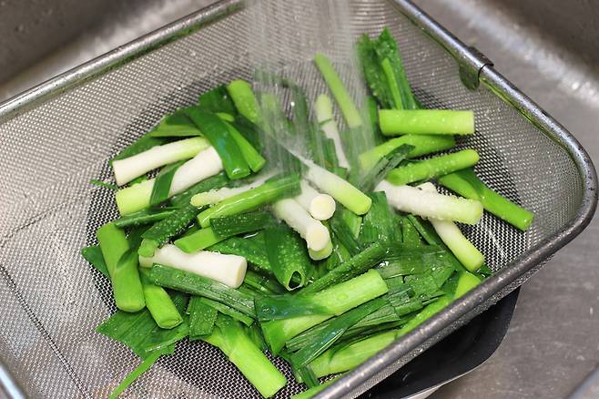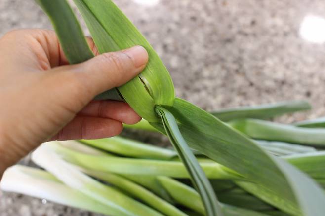 풋마늘을 세척할 때는 초록색 줄기 안쪽까지 꼼꼼히 닦아야 해요. 이곳에 흙이 많이 뭉쳐있기 때문이에요.