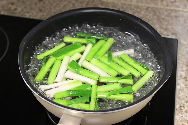 물이 팔팔 끓기 시작하면 두꺼운 줄기부터 넣어 40초 정도 데쳐요. 두께가 다르기 때문에 데치는 시간을 차이를 둬야 비슷한 식감이 돼요.