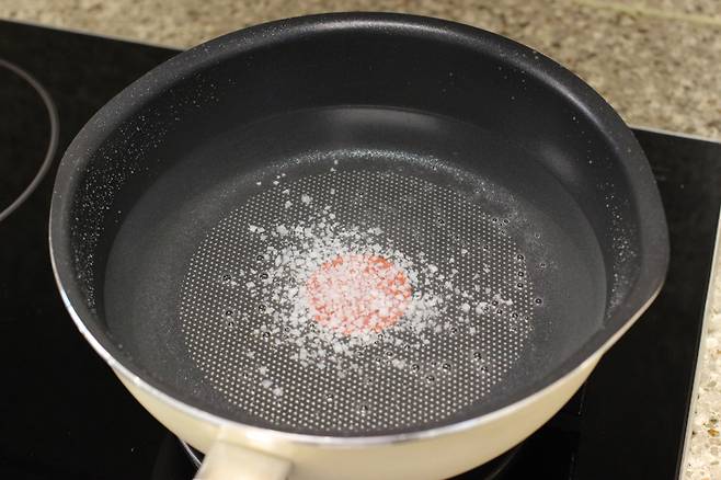 냄비에 물을 1L 정도 붓고 굵은소금 1큰술 넣어 강불로 끓여요.
