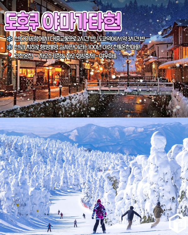 센다이 공항에서 대중교통으로 2시간 반 거리에 위치한 도호쿠 야마가현은 일본 내에서도 손꼽히는 다설 지역으로 겨울철 독특한 풍경과 이색적인 경험을 즐길 수 있는 일본 소도시입니다.