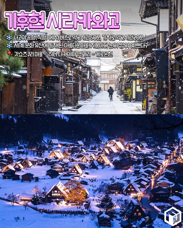 또 시라카와고에서 방문했다면 일본 전통 건축물과 분위기 있는 상점가가 매력적인 다카야마 옛거리와 게로 온천을 함께 방문하면 좋아 추천드리는 겨울 일본 여행지입니다.