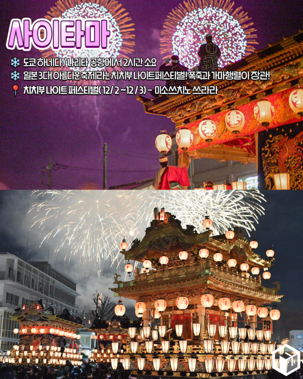 도쿄역에서 약 2시간 거리에 위치한 사이타마현에서는 매년 12월 2일부터 3일 2일간 사이타마 치치부 나이트 페스티벌을 개최합니다. 유네스코 무형문화유산으로 등록된 치치부 나이트 페스티벌는 일본 3대 아름다운 축제로도 손꼽히는 축제인데요.