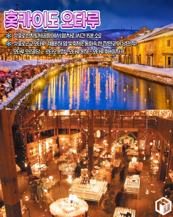 삿포로 근교에 위치한 작은 항구 도시인 오타루는 겨울 운하의 빛 축제가 로맨틱한 분위기를 더해주는 홋카이도 소도시입니다. 특히 겨울철 운하 주변은 은은한 조명과 눈으로 덮인 길로 장식되어 일본 현지들 사이에 겨울철 데이트 명소로 유명한데요.