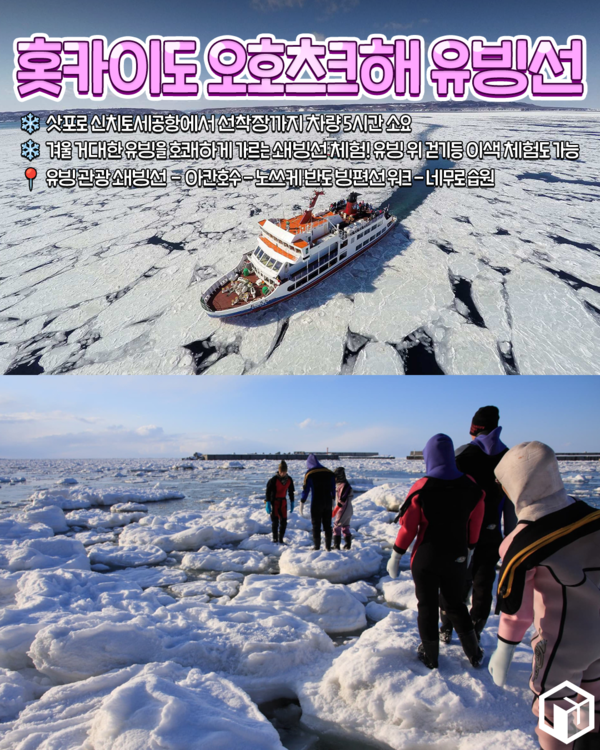홋카이도 북동부의 오호츠크해는 겨울철 유빙이 바다 위에 깔리는 장관을 자랑하는데요. 쇄빙선을 타고 유빙을 가르지며 얼음을 깨는 전율을 느끼는 독특한 경험을 즐길 수 있어 인기있는 투어라고 합니다.