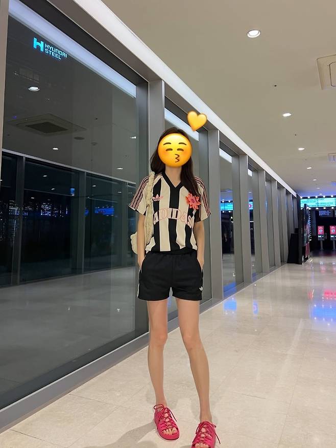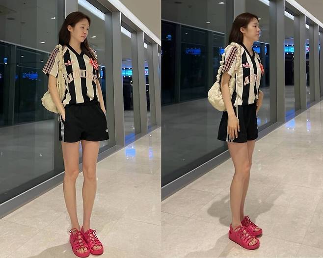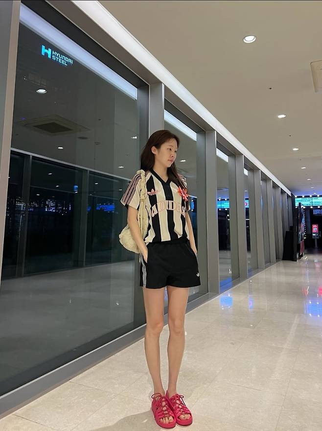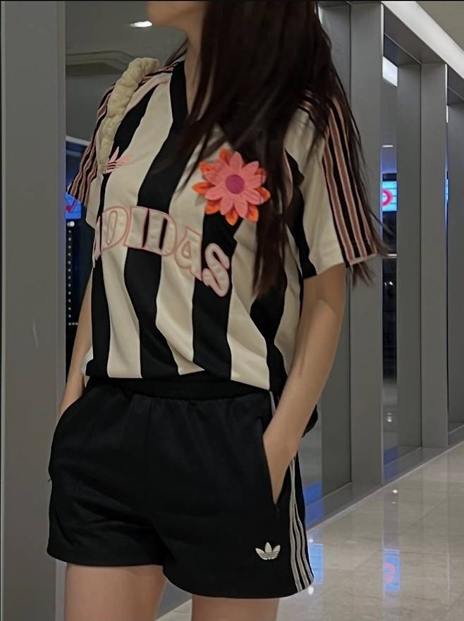 노윤주는 아디다스의 스트라이프 저지 셋업에 큼직한 퀼팅백을 매치하며 편안하면서도 트렌디한 애슬레저룩을 완성했습니다.