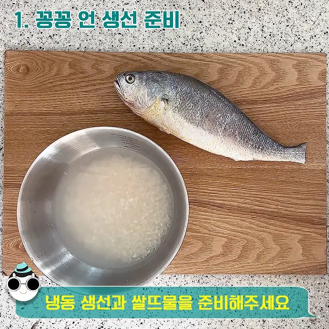 두둥 꽁꽁 언 생선 등장이요! 이렇게 얼어 있어도 해동 시간 오래 걸릴 걱정은 NO! 쌀뜨물에 담가서 10분만 있으면 자연스럽게 해동이 된 생선을 마주할 수 있답니다.