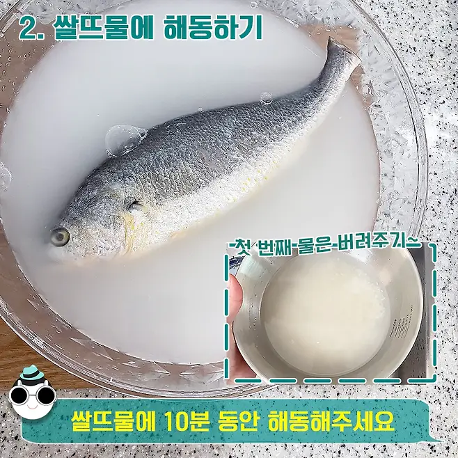 또 쌀뜨물에 담가두면 해동만 아니라 비린내도 자연스럽게 제거할 수 있어요. 쌀뜨물 속 전분이 생선 비린내를 흡착해서 냄새가 싹~사라지거든요. 게다가 생선 본연의 깔끔한 맛도 살아나서 1석 2조의 효과가 아주 GOOD!