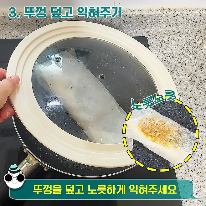 마지막 단계는 스팀 효과로 생선 속살까지 잘 익도록 프라이팬 뚜껑을 덮어주세요. 3분에 한 번 뒤집어 가며 이렇게 종이 호일이 노릇노릇해 질 때까지 구워주면 끝이랍니다.
