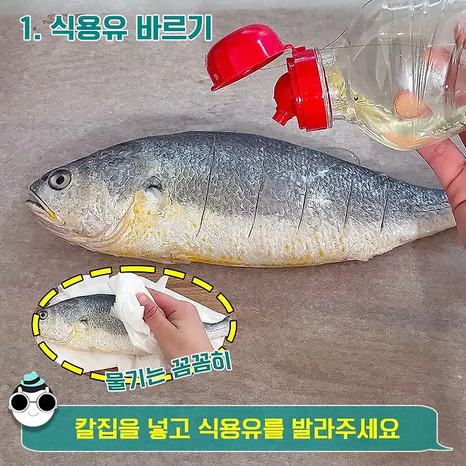 다음은 생선 위에 식용유를 뿌리고 골고루 발라주세요.