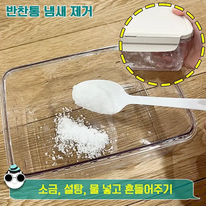 이때 반찬통에 소금과 설탕을 한 스푼, 물을 넣어서 양옆, 앞뒤로 흔들어주면 냄새가 사라집니다. 여기서 햇볕에 반찬통을 말려주게 되면 색도 다시 돌아오게 되니 말릴 땐 햇볕에 말려주기~ 참고해 주세요!