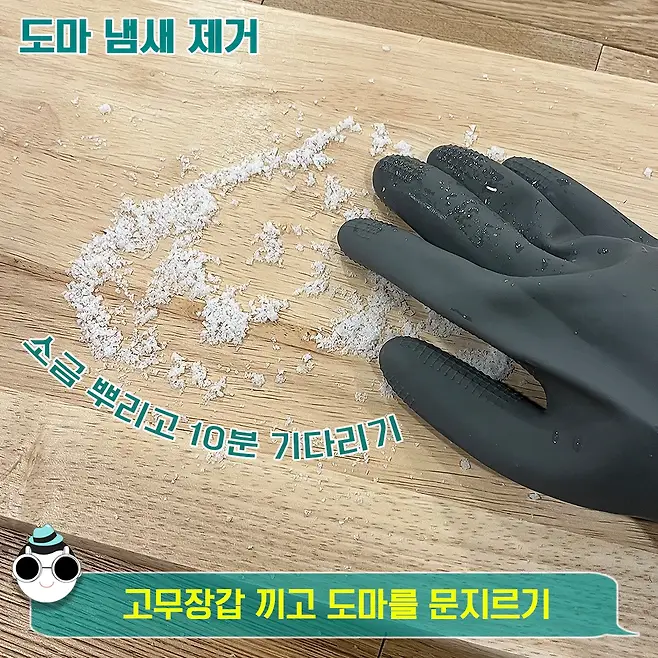 저는 세제를 이용해서 닦긴 하지만 친환경으로 청소하면 더 좋잖아요. 이럴 땐 도마에 가는 소금을 뿌리고 10분 동안 기다린 후 고무장갑을 끼고 도마를 문지르면 냄새도 제거할 수 있답니다.