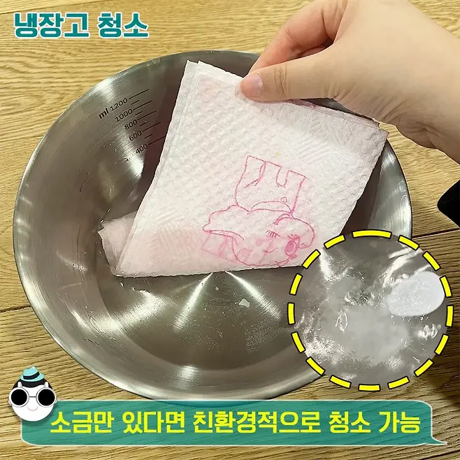 따뜻한 물에 녹인 소금물을 물티슈나 행주 타월에 묻혀 냉장고 이곳저곳을 닦아주세요. 소금이 소독 효과까지 더해주어 깔끔하게 청소가 가능하답니다.