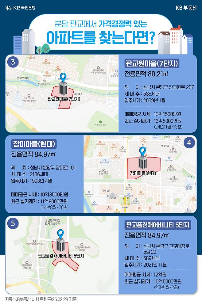 성남시 분당구에서 비교적 저렴하게 새아파트를 마련하고 싶은 분들이라면 판교대장지구로 눈을 돌려보세요. 이 중 판교풍경채어바니티 5단지는 2021년 입주한 5년차 총 589세대 아파트입니다. 이 단지 전용 84.97㎡의 KB시세 일반가는 12억원이며, 최근 실거래가(2025년 1월 22일/2층)는 10억5000만원입니다. 판교테크노밸리가 가까우며 제3판교 테크노밸리 개발에 따른 수혜도 기대되는 곳입니다.