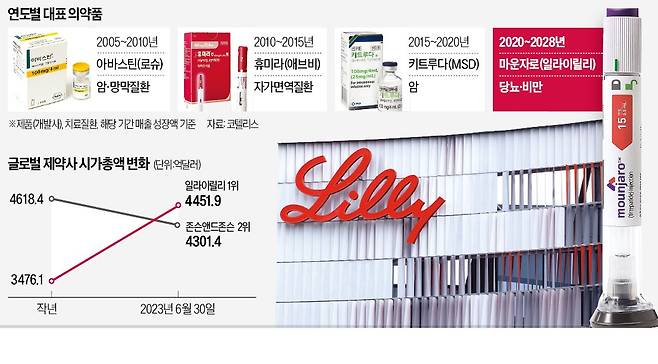 미국 제약사 일라이릴리와 존슨앤드존슨의 지난달 말 기준 기업가치다. 2011년 이후 10여 년간 미국 화이자를 누르고 세계 제약·헬스케어 기업 시가총액 1위 자리를 지켜온 존슨앤드존슨의 독주 체제가 지난달 무너졌다. 새롭게 왕좌에 오른 릴리의 무기는 ‘게임체인저’로 불리는 당뇨·비만약인 마운자로다. 세계 제약·바이오업계가 패러다임 대전환 시대를 맞았다는 분석이 나온다.