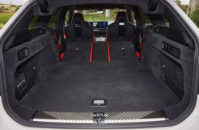 트렁크를 열어보면, 계단식 립이 없는 넓은 적재 공간이 눈에 띕니다. 양쪽 뒷바퀴 옆의 작은 덩어리만 제외하면 바닥은 완전히 평평합니다. 뒷좌석은 분할 폴딩이 가능하며, 완전히 접으면 기본 17.7큐빅피트(500리터)의 적재 공간이 약 57.6큐빅피트(1,631리터)까지 확장됩니다. 아우디 RS6와 BMW X5 M이 M5 투어링보다 조금 더 넓은 공간을 제공하지만, M5 투어링은 세단이 아닌 왜건을 선택해야 할 충분한 이유를 제시하는 다재다능한 패키지입니다.