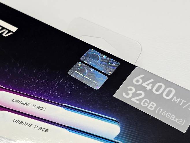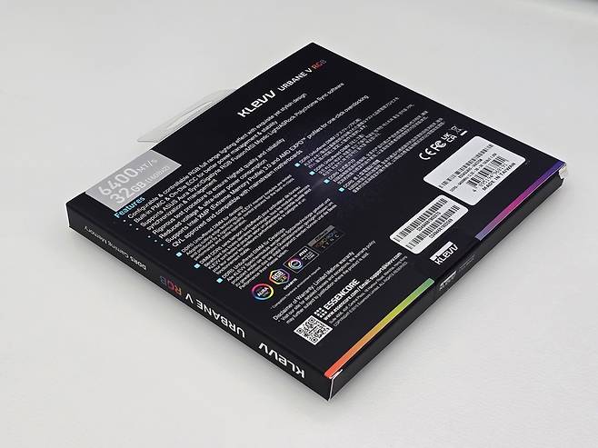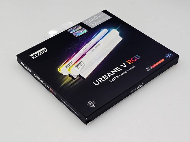ESSENCORE KLEVV DDR5-6400 CL32 URBANE V RGB 메모리 패키지에는 제품 사진과 함께 듀얼빔 LED가 강조된 모습이 인상적입니다.