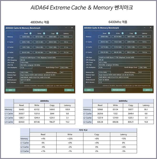※ AIDA64 벤치마크 테스트의 결과는 메모리 절대 성능의 기준표가 아닌, 클럭에 따른 상대적 편차 비교를 위해서만 참고하시기 바랍니다.