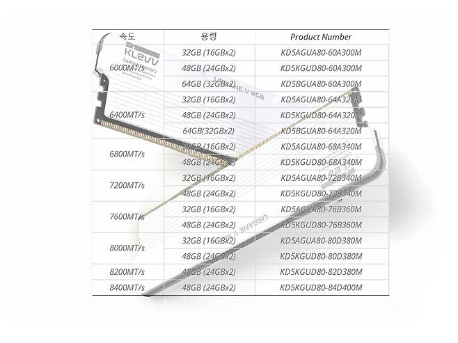 먼저, ESSENCORE KLEVV URBANE V RGB 시리즈 메모리는 6,000Mhz 클럭 속도부터 최대 8,400Mhz 클럭 속도 제품까지 공개되었고, 용량은 32GB, 48GB, 64GB로 제공이 됩니다. 국내에는 모든 클럭 제품이 출시된 것은 아니고 현재는 6,000Mhz와 6,400Mhz 제품만 출시가 된 상태입니다. 참고로 색상은 화이트 색상 단일로 출시가 되었습니다.