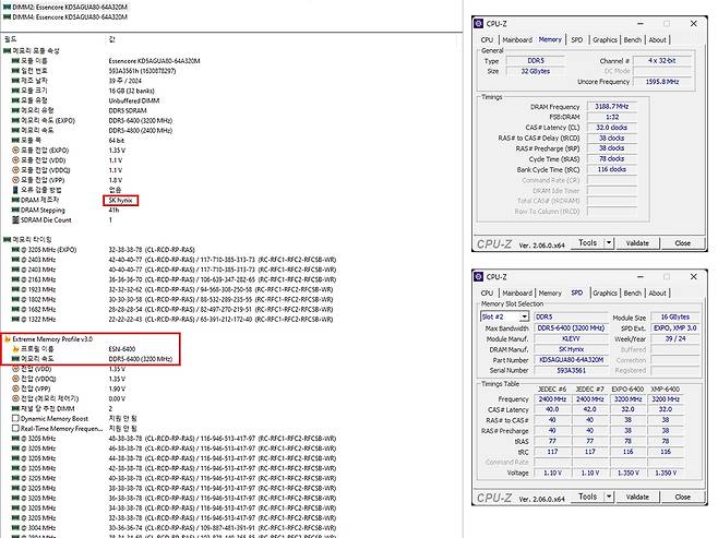 CPU-Z와 AIDA64로 확인해 본 결과, 6,400Mhz 오버클럭이 자동으로 적용되었습니다. 참고로 에센코어 클레브 메모리는 SK하이닉스의 자회사이므로 당연히 DRAM 모듈은 SK하이닉스 제조를 사용했기 때문에 더 많은 분들이 찾는듯합니다.