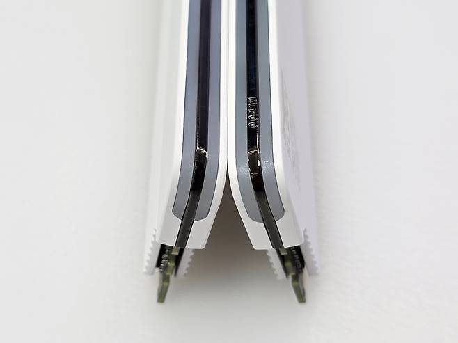 보는 각도에 상관없이 양쪽 듀얼빔 LED가 모두 보이게 되어있고, 모서리가 각 지지 않은 라운드 스퀘어 형태인데다 LED가 그 끝가지 나오다 보니까 엔드리스(Endless) 한 LED의 느낌도 너무 좋습니다. 그리고 LED 때문에 메모리 한 개가 마치 두 개처럼 보이기도 하는 시각적 효과도 있습니다.