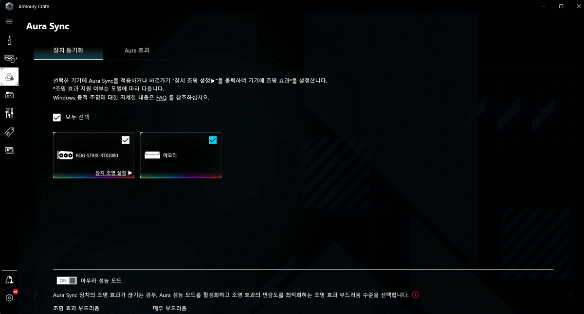 ASUS Aura Sync 프로그램을 통해 RGB LED를 세팅한 모습입니다. 좌우가 다른 듀얼빔 형상의 LED 디자인이 인상적인데요. 특히 가운데는 발광 면적이 더 얇아지는 변화가 있는 디자인이라서 더욱 다채로워 보입니다.