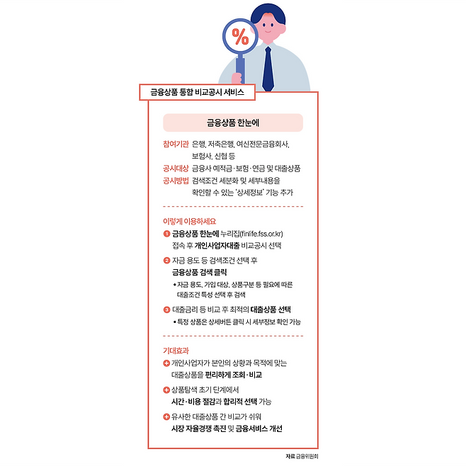 금융위원회가 '금융상품 한눈에'에서 개인사업자 대출상품 비교공시 서비스를 시작했습니다. 다양한 개인사업자 대출상품을 쉽고 간편하게 비교할 수 있게 되었는데요. 자세한 내용은 정책주간지 'K-공감'을 확인하세요.