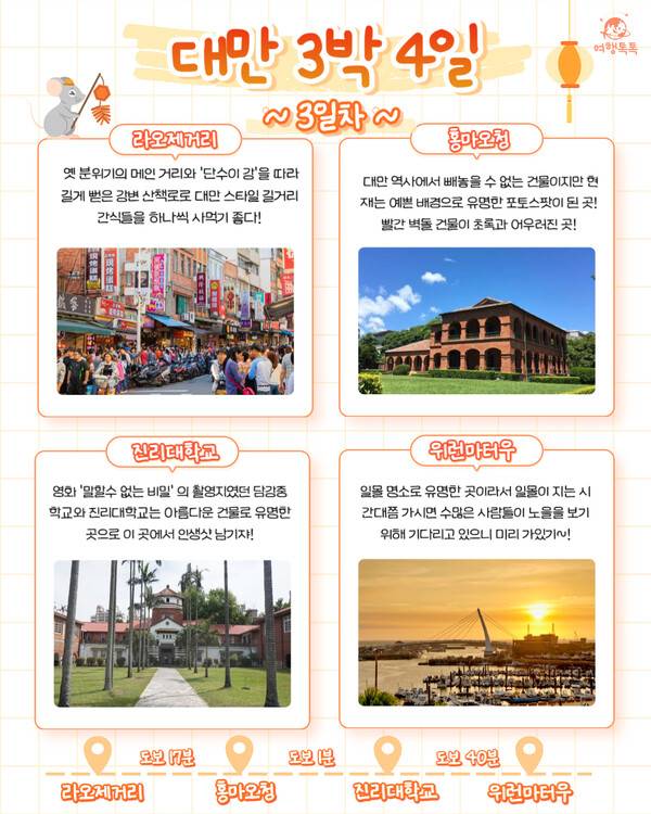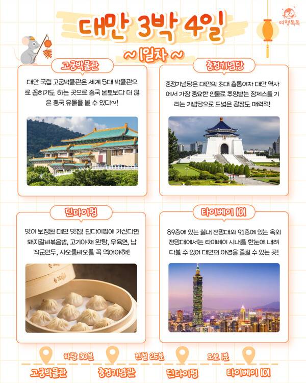 오늘 여행톡톡에서는 지하철과 버스를 이용해 차근차근 둘러보기 좋은 대만 자유여행 3박 4일 일정과 경비를 소개해드리려 합니다. 70만원 이하로 다녀올 수 있으니 긴 연휴기간이나 겨울에 다녀오시는 건 어떠신가요?