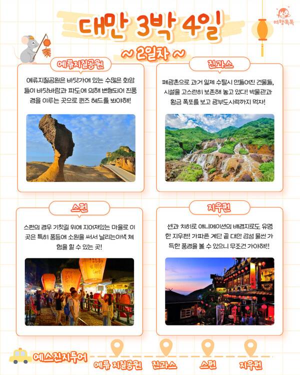 대만여행 하면 '예스진지'를 빼놓을 수가 없는데요. 대만의 유명한 여행지인 예류, 스펀, 진과스, 지우펀을 묶어서 부르는 단어입니다. 예스진지는 대중교통으로 다니기는 조금 어려운데요. 기차나 버스를 이용하신다면 한군데 정도는 가실 수 있지만, 4곳을 모두 둘러보시기에는 역시 택시투어만한 것이 없습니다.
