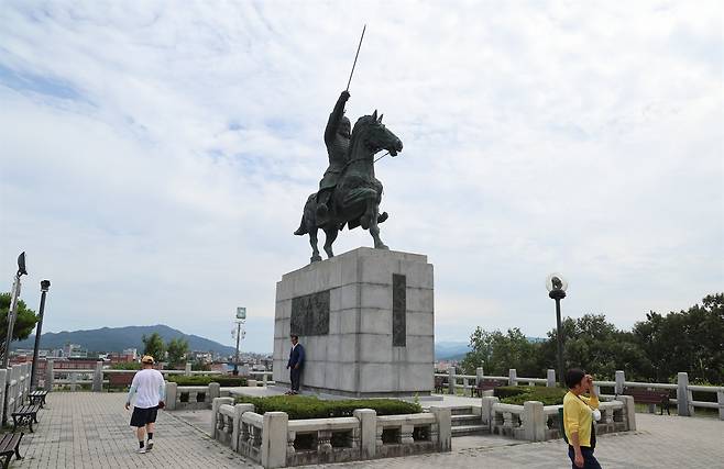 | ▲ 신라의 삼국통일 과정에서 큰 공을 세운 김유신의 동상 아래 경주시민들이 서있다. |