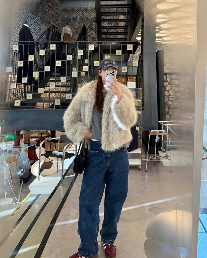 세련된 편집숍을 배경으로, 부드러운 베이지 톤의 퍼 아우터를 걸쳐 겨울철의 포근함과 럭셔리한 무드를 동시에 잡았는데요.
