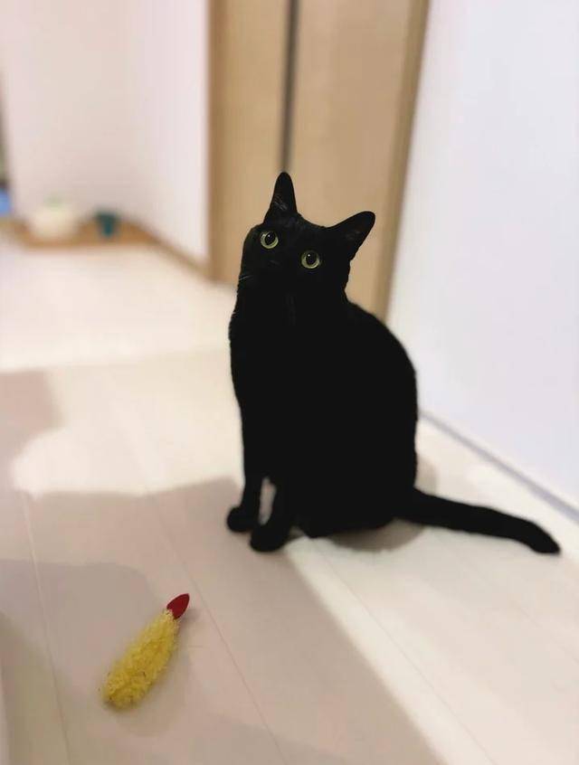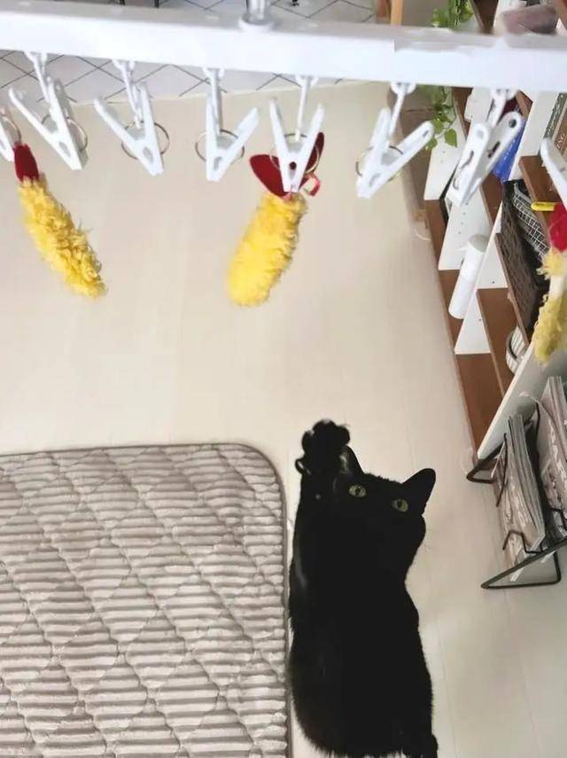 며칠 전, 주인이 그 새우튀김 장난감을 깨끗하게 세탁하고 말렸습니다. 아기 고양이는 장난감을 잃어버린 듯 안절부절못하며, 빨래 건조대에 걸린 장난감에 한없이 집중했습니다.