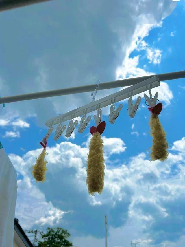 처음에는 살균도 할 겸 햇볕에 말리려고 밖에 걸어두었는데, 놀랍게도 작은 새들까지 그 새우튀김 장난감에 큰 관심을 보였습니다.