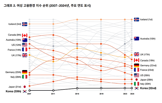 한국의 상황은 어떨까요? 지난 2024년 기준 한국의 여성 고용환경 지수(WIW)는 49.1점으로 33개 국가 중 32위를 차지했습니다. '여성 고용환경 지수'가 처음 발표된 지난 2009년부터 지금까지 최하위권을 여전히 탈출하지 못했습니다. 그만큼 한국의 '직장 내 성평등'이 더디게 진행되고 있다는 뜻이기도 합니다.