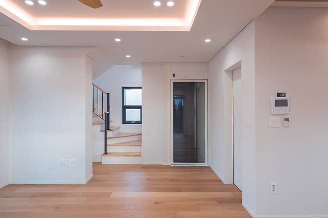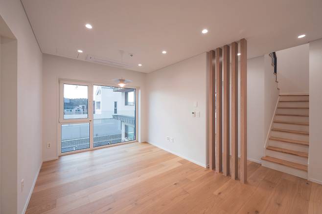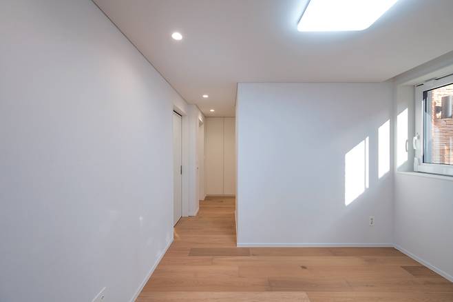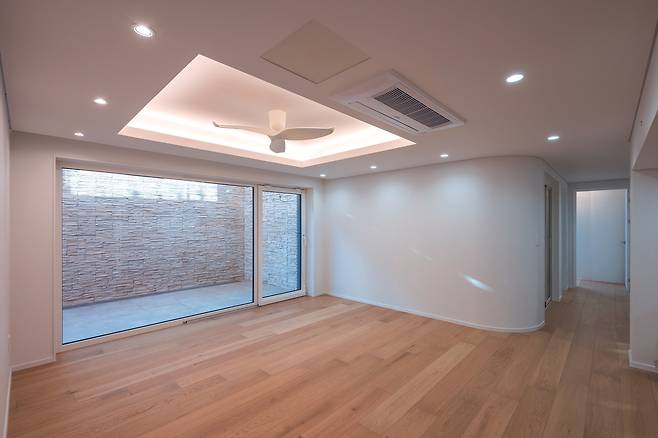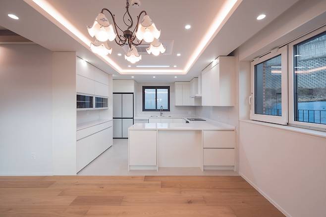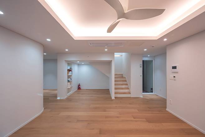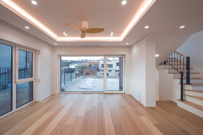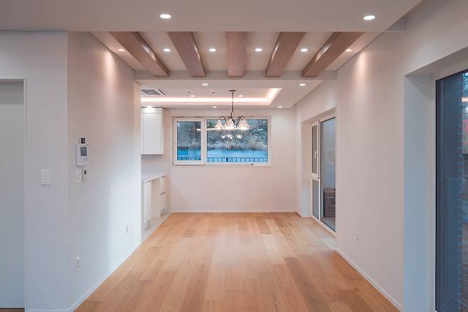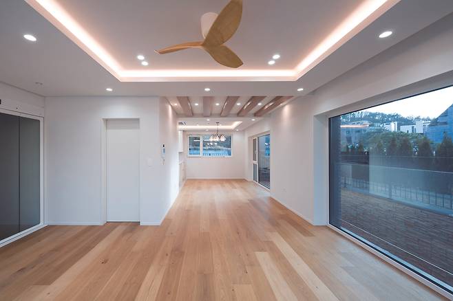 전체적인 콘셉트에 맞춰 오크 앤 화이트를 바탕으로 시공했고 우드 톤 실링팬 등으로 마루의 감성을 한층 살렸다. 특히, 마당으로 연결되는 방향에는 자연 채광을 극대화할 큰 창을 설치했다.