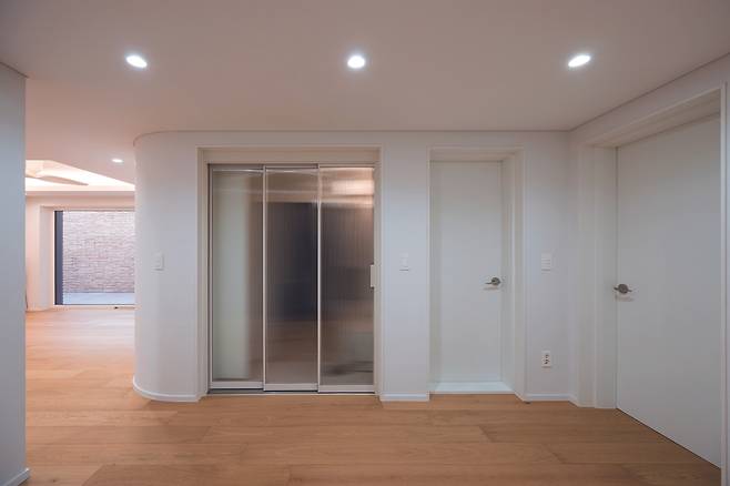 오크 앤 화이트 베이스에 맞춰 크림 색상으로 계획했다. 3연동 슬라이딩 도어는 불투명 유리를 사용해 불필요한 시선을 차단했다.
