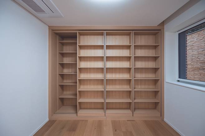 한쪽 벽면 전체를 책장으로 채웠다. 슬라이딩 레일을 사용해 2단으로 설치했으며, 공간 대비 많은 양을 수납할 수 있는 디자인을 적용했다.