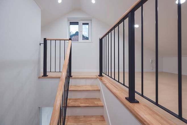 각각 다른 용도로 활용할 수 있도록 가운데 계단을 기준으로 양쪽으로 분리했다. 박공지붕을 그대로 살려 너무 협소하지 않은 아담한 공간이 마련됐다.