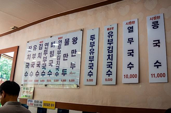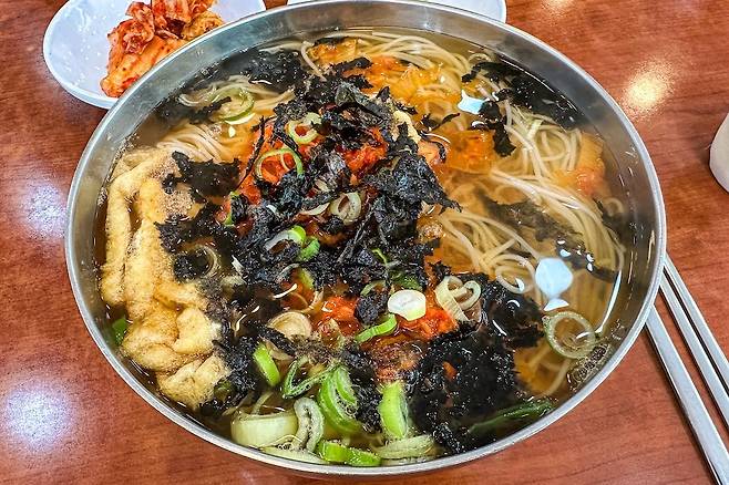 이곳은 멸치육수를 기본으로 하는 잔치국수와 매콤한 장을 버무린 비빔국수가 시그니처이다. 이곳의 비빔은 간이 있는 편이어서 심심한 비빔을 좋아하시는 분은 호불호가 갈릴 수도 있다. 예전에는 이렇게 잔치와 비빔으로 시작했던 영업이 시간이 지나면서 추가 메뉴가 등장해 요즘에는 유부국수도 있고, 잔치국수를 얼큰하게 먹을 수 있는 김치국수도 있다. 개인적으로 잔치국수, 비빔국수 그리고 김치국수를 추천하고 싶다.
