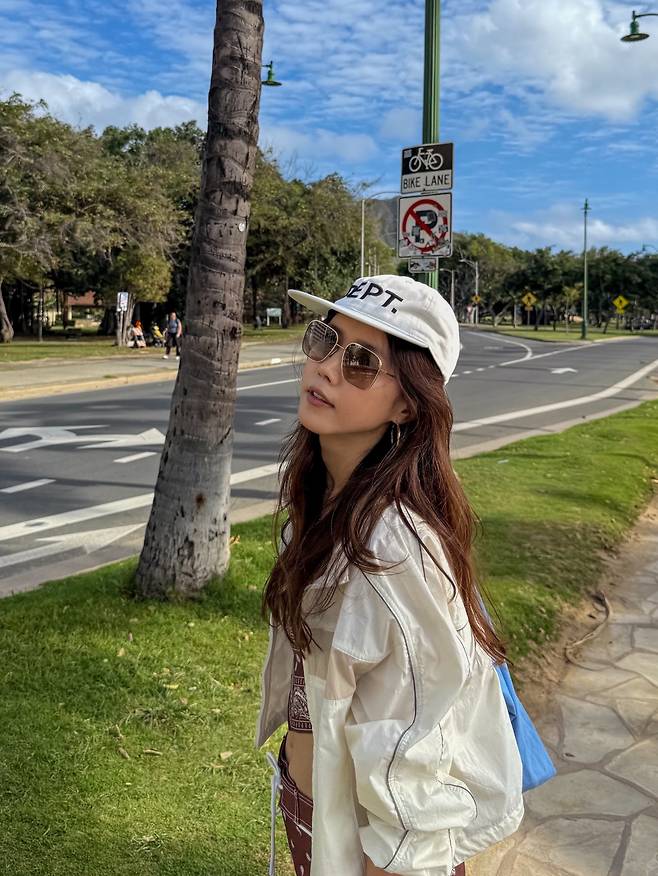 자칫 평범할 수 있는 스포티한 차림이지만, 화이트 캡 모자와 보잉 선글라스를 더해 쿨하고 힙한 분위기를 연출한 점이 인상적입니다.