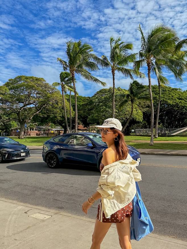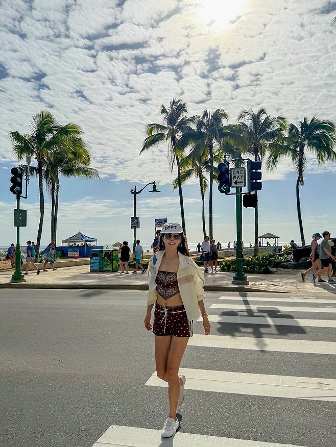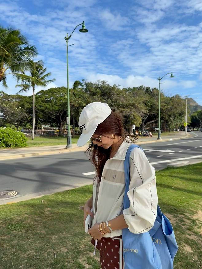그녀는 화이트 톤의 가벼운 윈드브레이커에 유니크한 페이즐리 패턴이 가미된 브라운 쇼츠를 매치하여 활동성과 스타일을 동시에 잡았습니다.